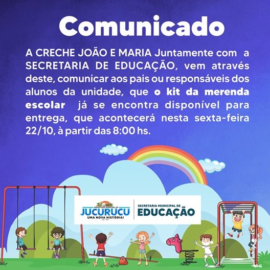 A Direção da Creche Municipal João e Maria, comunicou na tarde desta quinta-feira (21), que a distribuição do Kit Merenda Escolar, acontecerá nesta sexta-feira (22), à partir das 8hs da manhã.